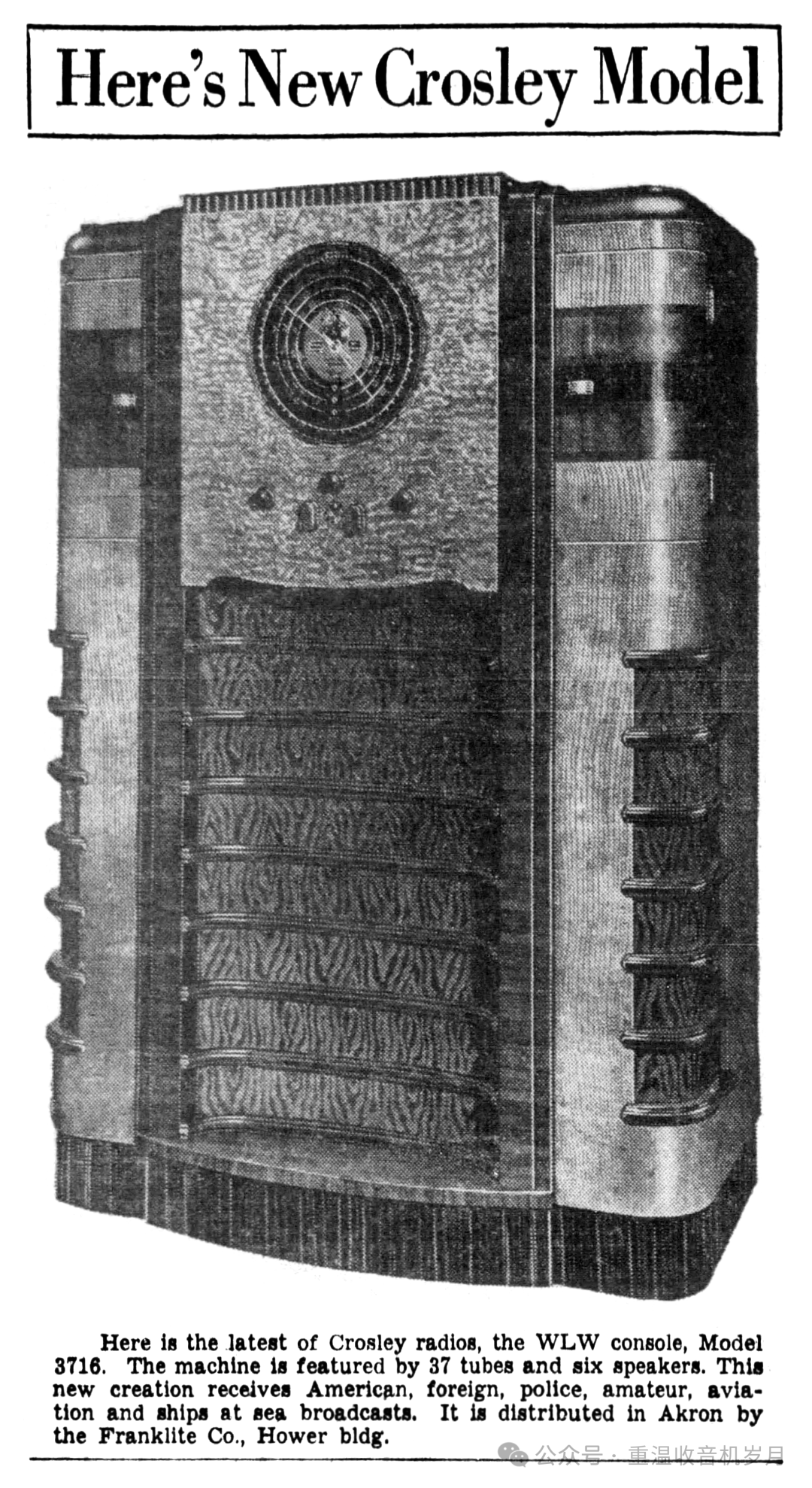 图中是Crosley最新款收音机 ——WLW 落地式,型号 3716。该设备配备 37 个真空管与 6 只扬声器。这款新品可接收美国本土、境外、警用、业余无线电、航空及海上船舶广播信号。该机型在阿克伦市由Hower大厦的Franklite公司负责分销。
