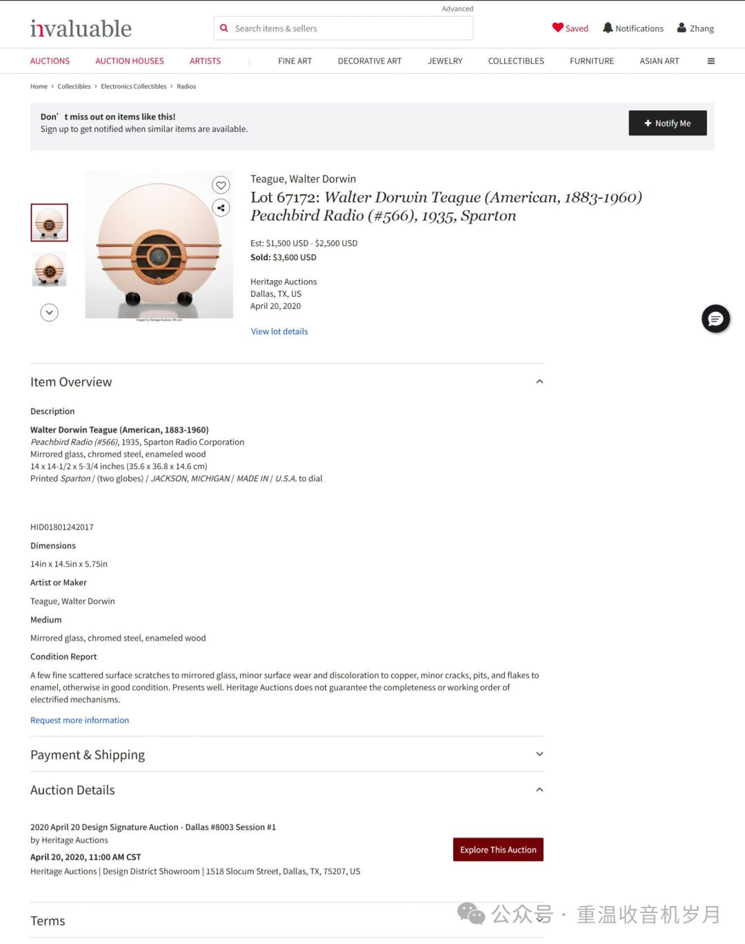 2020年4月20日,Heritage拍卖的桃色Bluebird(Peachbird)以3600美元成交。
