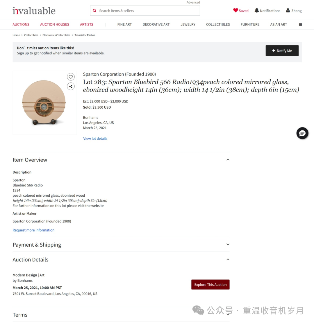 2021年3月25日,Bonhams拍卖的桃色Bluebird(Peachbird)以3500美元成交。