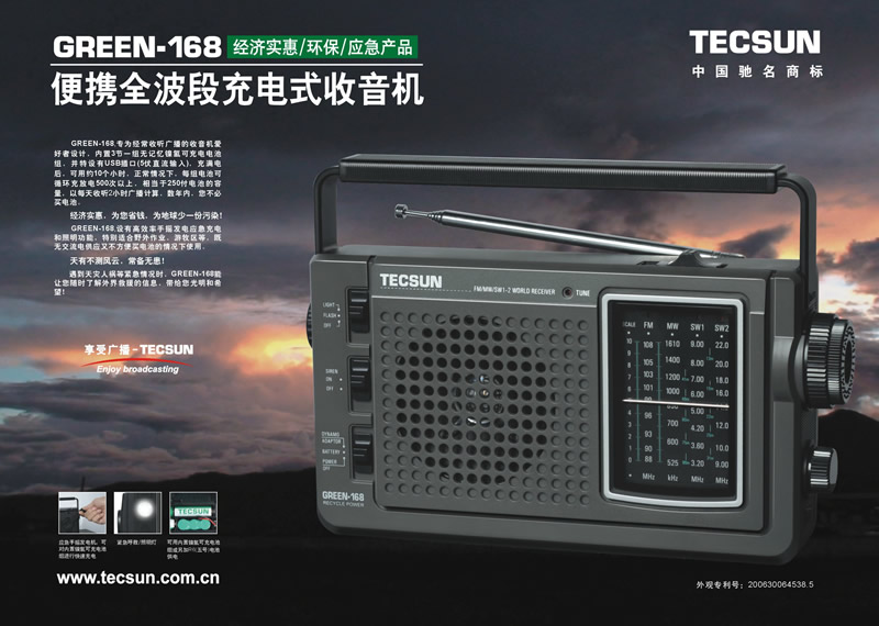 GREEN-168,专为经常收听广播的收音机爱好者设计,内置 3节 600毫安时无记忆镍氢可充电电池组,并配备专用交流充电器,充满电后,可用约10 个小时,正常情况下,每组电池可循环充放电500次以上,相当于250付电池的容量,以每天收听2小时广播计算,数年内,您不必购买电池。
