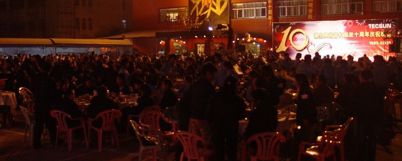 东莞市德生通用电器制造有限公司的股东、全国各地总代理、全体干部员工,东莞市一德电感器件制造有限公司全体干部员工、东莞市大德精密模具制造有限公司、东莞市嘉德电声器材公司的全体干部员工1400多人齐齐聚集在景泰广场,庆祝德生收音机上市十周年。