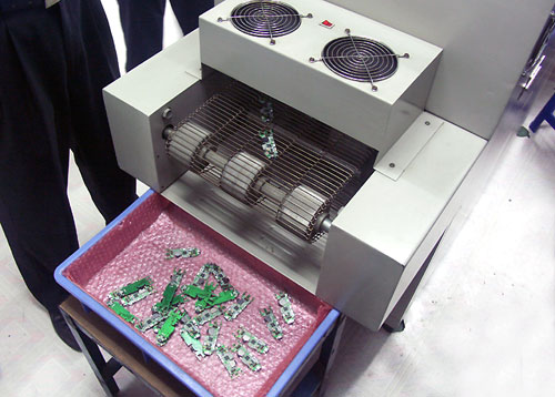 所需的元件虽然贴上电路板,但和电路板之间还不是真正的连接,只是通过锡膏的粘性粘在一起,所有电路板将马上进入回流焊炉中,高温固定焊接点。等电路板从焊炉出来已经基本成型,电子元件也都稳稳地焊接到了电路板上。
