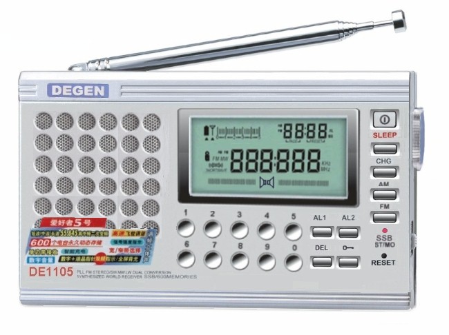 动态 网友自创DE1105 广播发烧网 2004-05-14 00:00 · 2055 0 哈哈!!!我的爱好者五号(DE-1105)产品名称 DE1105数字调谐调频立体声/中波. 短波.国际接收 功能介绍 调频/短波/中波国际接收。调频频率范围 88.00-108.0MHz,TV-1、TV-2,步长25K。调幅(含短波.中波)频率范围:520-29999KHz,步长1K。调幅波段高中频(55.845MHz)二次变频,高灵敏度,高抗干扰性能。飞梭/自动搜索/记忆/直接输入/语音输入五种调谐方式。600个电台永久存储。可用语音/按键记忆、删除,信息永久保存。电子音量控制,两种调节方式:数字直接输入与飞梭调节。 智能快速充电功能(兼容镍氢/镍镉电池),充电倒计时查询。单边带(SSB)接收及微调功能。调幅中频宽/窄带。面板全橙色背光功能,三种背光模式设置。调幅、调频信号强度指示。调幅、调频单声道/立体声选择、音量大小指示。新闻/音乐/超重低音三种音质选择。两个定时开、关机功能(可分别设置定时开机频率与音量)。睡眠关机时间1~99分钟设定。时钟常显、掉电不丢失功能。电子开关按键锁定功能。按键操作错误提示。 电池电量指示,可查看当前电量,电量不足自动关机。进口扬声器,音质优美。设远近程灵敏度选择开关,方便接收不同环境、米你型机身设计便于携带。内置式360度旋转拉杆天线。使用2节5号电池供电。附送高级立体声耳机、外接天线、外接稳压电源适配器、2节5号镍氢充电电池、绒面布套。外型尺寸:110x71x20mm 点赞 0 文章目录 × 推荐阅读SHARP夏普宣布恢复生产盒式录音机、GF-777N便携式收音机德生TECSUN PL-880 全波段数字调谐立体声收音机上市TECSUN H-501、PL-990 全波段数字调谐立体声收音机/音乐播放器上市公告日本厂商2023年推出新款磁带收音机:支持U盘数据转录2025年夏季短波调谐频率TECSUN PL-660全波段数字调谐收音机全球同步上市!(2010-11-12)厂家纷纷倒闭,互联网收音机何去何从收音机为什么不淘汰掉?因为在特定场合仍需使用它TECSUN PL-380全波段数字解调立体声收音机上市公告从收音机到智能座舱,从听到动动嘴改变“世界”,车机系统已经走过了100年 上一篇 菜鸟测评DE1103(全部) 下一篇 收音机爱好者的QQ群