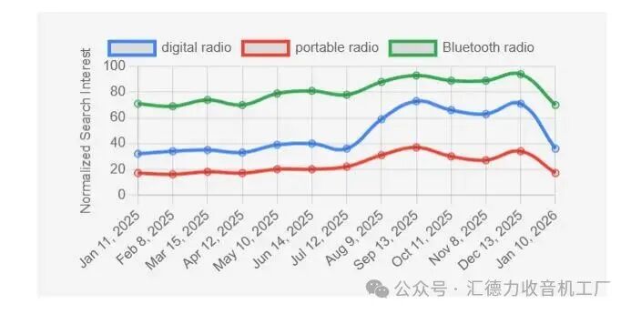 数字收音机和蓝牙收音机市场正在经历显著增长。从2025年全年到2026年初,蓝牙收音机的搜索量持续高于数字收音机和便携式收音机,表明消费者对无线连接和现代音频解决方案有强烈偏好。