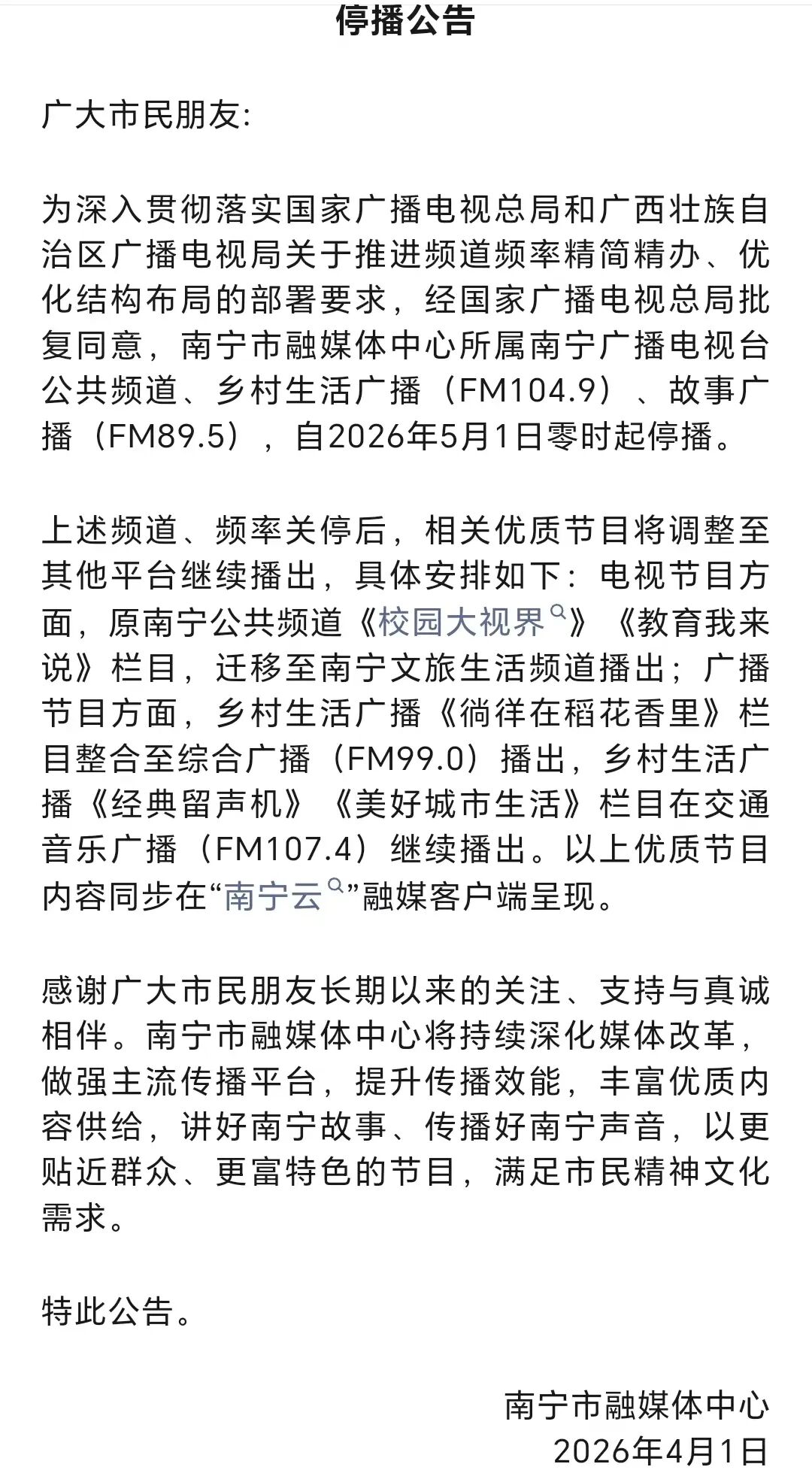 近日,南宁市融媒体中心发布《停播公告》,其中,经国家广播电视总局批复同意,南宁市融媒体中心所属南宁广播电视台公共频道、乡村生活广播(FM104.9)、故事广播(FM89.5),自2026年5月1日零时起停播。