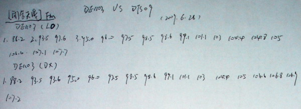德劲DE1103在FM下采用自动搜索节目预览,最小步进为0.1Mhz,选择本地(LO)和远程(DX)时接收性能相差不大,见下,略有差别,停顿点相对也比较准确。