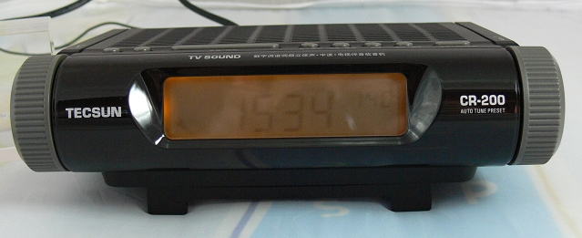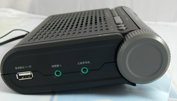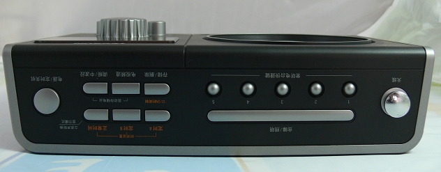 两侧是旋钮,右侧是调谐飞梭,左侧是音量控制旋钮,飞梭和CR1000不同,只能旋转不带按钮开关,飞梭调谐时手感不错,当你快速旋转飞梭时,机器就会进入自动调谐状态,当收到电台时,就会停止调谐,进入正常的收听状态,喇叭在机器的顶部,顶部前端安排了八个按键,从油至左分别是:电源/定时关机、频率/地址(选台方式)、波段(自动存储)、存储/删除(12/24小时制)、显示模式(正常时间)、贪睡/照明、定时B、定时A。这些按键都是多功能键,CR200没有了CR1000那样的有5个常听电台预存键。机器的右侧没有任何按键和输入/输出接口,机器的左侧则有输入/输出端口,有立体声耳机输出,有线路输入,还有一个只有在数码产品上才能见到的USB接口。当USB借口出现在传统的模拟收音机上,确实会让人感到新奇,其实这恰恰是德生工程师们在以人性化为本的理念指导下的产物,这个USB接口是一个充电插口,很实用,真是随时可以对身边的数码产品进行充电,,尤其对拥有手机、MP3的用户,更是带来人性化的贴心服务!说到这里我忽然想德生要是再设计一个带有USB插头的高亮度发光二极管的小灯,晚上调收音机时,将灯插入插座,一边可以听收音机,一边可以在USB照明灯下看书,是何等的惬意!该机的灵敏度也和CR1000一样,相当的好,没有短波的机器个人认为没有太大的必要去把这些机器和带短波的机器去对比!因为CR200和CR1000是定位于电视伴音系列。机器的前底部有一下支架,用来抬升机器的前部,让视角更好!CR200和CR1000一样,也拥有ATS自动搜索存储功能,操控性很好,哪怕不看说明书也不会让人不知所措!机器的温度显示也是和CR1000一样,温度显示精确。CR200的声音没有CR1000那样优美动态!但该机器的喇叭还是相当不错。值得一提的是该机加了一个线路输入,而该输入端口很特别,只要你不把222V交流电源线拔掉,无论是是开机还是是关机状态,只要插入线路输入,机器就会自动播放你从线路输入中送入的信号,这个功能相当的方便,足以见得德生人在开发新产品时高瞻远瞩!个人建议在机器的后背加一个220V的电源开关,一般这机器会永远插在电源插座里,哪怕不工作,变压器的初级线圈还是长期通电的,安全还是会有一定的隐患,要是增加一个电源开关,在220V输入变压器前加了开关,那样可以长期不用拔插头,不用时只要关了开关就可以了,时间用电池来维持!该机采用的是软天线,机器的后背很别扭,一个电源线和一根软天线,虽然说是床头机,但为啥不给用户机会选择ZY移动?电线和天线做成分离型就好了。对于该机的防误开关机而设计的延时开机功能,有点不习惯,对于收音机,特别是床头机,这样误动作的机会并不多,上次买的凯隆新机也是这样设计,感觉在使用上很不习惯,还是原先的那样,按下开关,直接开机来得爽!也许这仅仅是我个人的一点感受!飞梭调谐预存电台,非常非常别扭,CR200和CR1000不同,这小机没有快捷预设存储键,所以想要收听电台调谐都要靠飞梭调出预置台,而随之而来的问题是:CR系列机器是调谐时静噪的,快速选择飞梭时是静音的,而CR200的飞梭旋钮比较宽大,且步进手感不太明显,调谐是必须看着液晶屏,如果不看屏幕的指示,凭耳朵和手感用飞梭调出一个个电台有很大的难度,如果能增加飞梭步进阻力,或在预置电台逐个搜索时给予“滴”的提示音就好了。