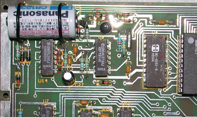 机器购来时发现不能存储频率,直接查原因是原装锂电池已经失效(电压只的0.5V),随即找到一只原照相机用完电的锂电池CR123A换上机器。起初觉得问题算是圆满解决,没想到5天后这个电池也同样很快失效。按保存COMS用电池的使用经验,一个这样的电池也应该至少能使用一年以上,这样迅速的放电肯定是电路的耗电不正常。关机后测量锂电池的静态电流已达到1.3mA,这样的耗电当然是用不了几天的。经过检查存储芯片U4 6551 的管脚发现有不明液迹存在,用纸清洁后,再测试锂电池静态电流下降为0.16mA。原想这回该是没有问题了吧。重新买来一个全新CR123A电池换上,留心测量了电池端电压为3.27V,24小时后再测端电压已降到3.08V。这样的电压下降速度引起本人的高度重视,仔细推算这样一个锂电池正常机器应该能使用20年以上,如果按上述耗电电流计算电池容量要达到28032mAh(2436520*0.16),显然这种电池是达不到这个容量的。要达到使用20年的目的至少耗电应该再下降10倍。经查机器关机后对锂电池耗电的只有存储芯片U4,重点检查其隔离二极管CR6之后的电路,发现在U4的22脚到18脚间接有一个10k电阻R55,其上电压有1.6V电流就达0.16mA,可见主要耗电在此电阻,按降低10倍耗电计算将10k电阻更换为100k。再测锂电池静态耗电已降到0.013mA,三天后锂电池端电压居然回升到3.11V。看来这回单个锂电维持20年的计划是可以实现了,不过这机器的其它电路是否同样能保持20年还能用可就难说了。