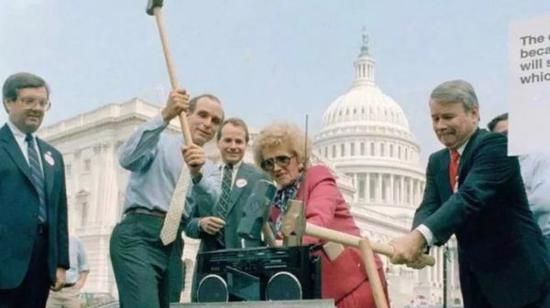 图注:1987年,美国五名国会议员在国会前公开砸一台东芝收录机