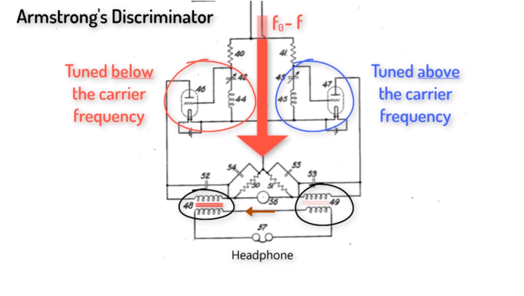 Armstrong 用线圈和电容器创建了两个调谐电路。 一个调谐到载波频率以上, 一个调谐到载波频率以下。 如果输入信号没有被调制,也就他与载波频率相同,那么在两个电路中效果都一样。 然后标记为 48 和 49 的两个线圈将感应出相同的电压,它们之间没有电流输出。